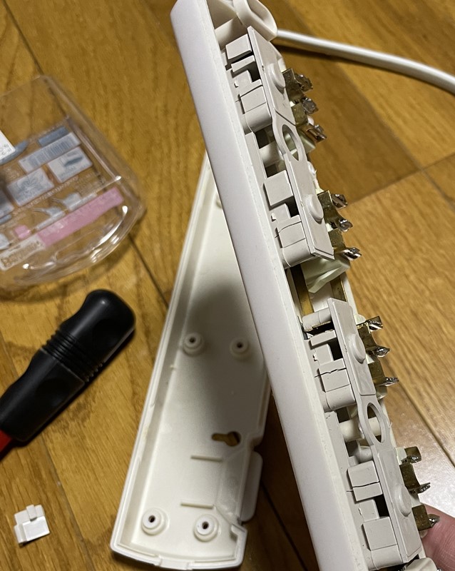 左下隅の破片が中に転がってる!・・・コンセントが刺さる部分を支える樹脂に全部ヒビが入ってる😨