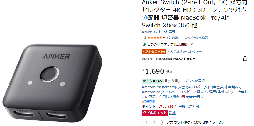 PC1台→2台のモニタ切り替え、PC2台→1台のモニタ切り替え ができる。1690円。